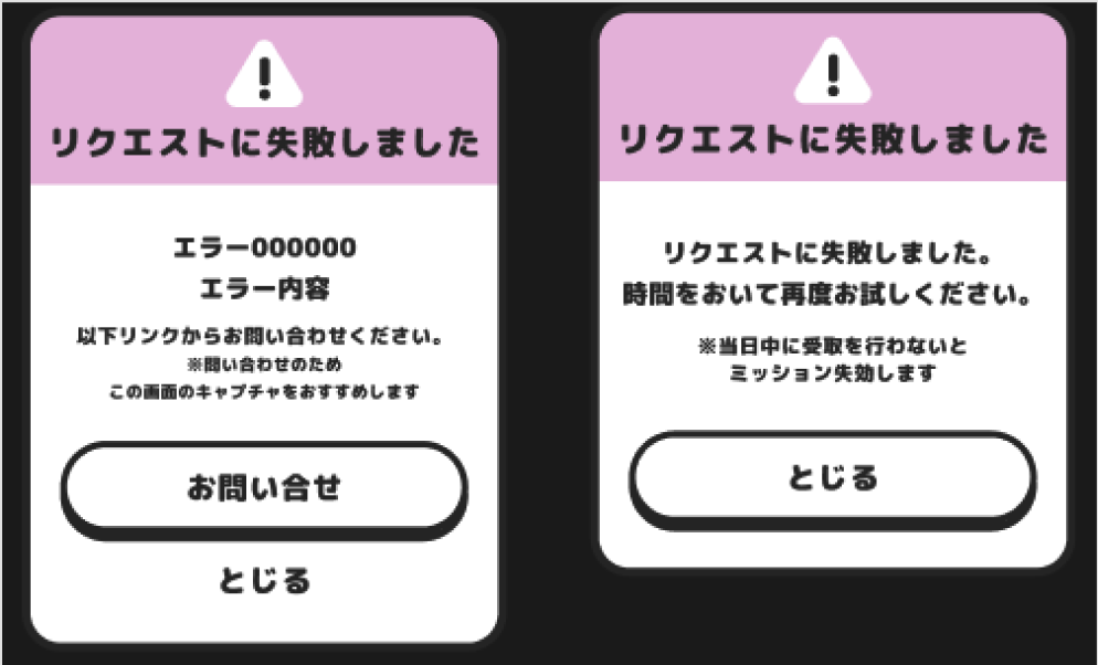ミッションで「リクエストに失敗しました」と表示され、コインを受け取れない 2025年09月12日 10:44 ミッションにて、コイン受け取り時に以下のエラーが表示された場合、コインが一時的に受け取れない場合がございます。 該当エラーでコインが受け取れない場合は、時間をあけて再度ミッションからコインの受け取りをお試しください。 関連記事 獲得コインがクラシルリワードに反映されない ポイポイうさぎについて